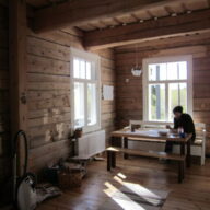 Salvon hirsikehiä kauniissa puuhallissa, hiljaisen metsikön suojissa, Pielavedellä.